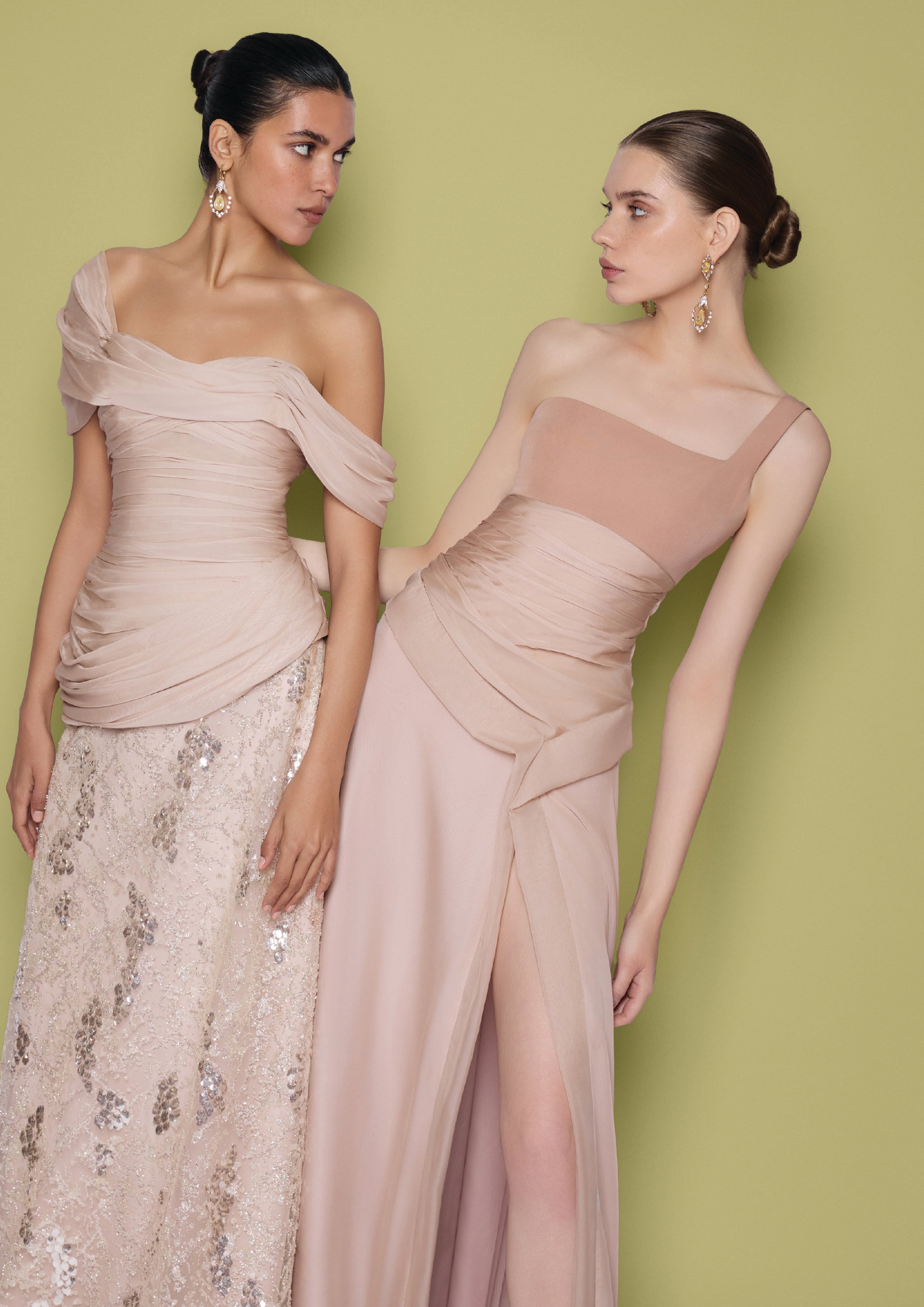 This gown is defined by its refined interplay of texture and soft, sculpted movement. Cut from airy mousseline, the silhouette falls fluidly to the floor, enhanced by subtle draping that shapes the body with effortless elegance. The bodice, crafted from structured crepe, creates a striking contrast in both texture and tone, offering a clean, modern finish. A one-shoulder neckline adds a contemporary edge, while the softly draped waist flows into a high slit, bringing lightness and graceful movement to the overall look.