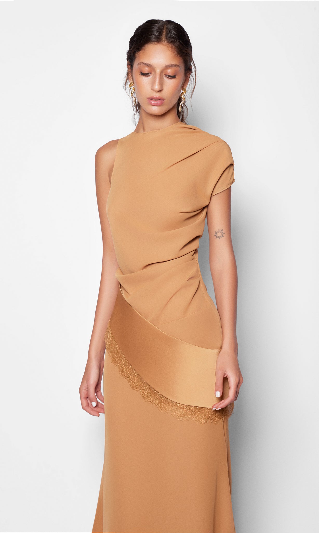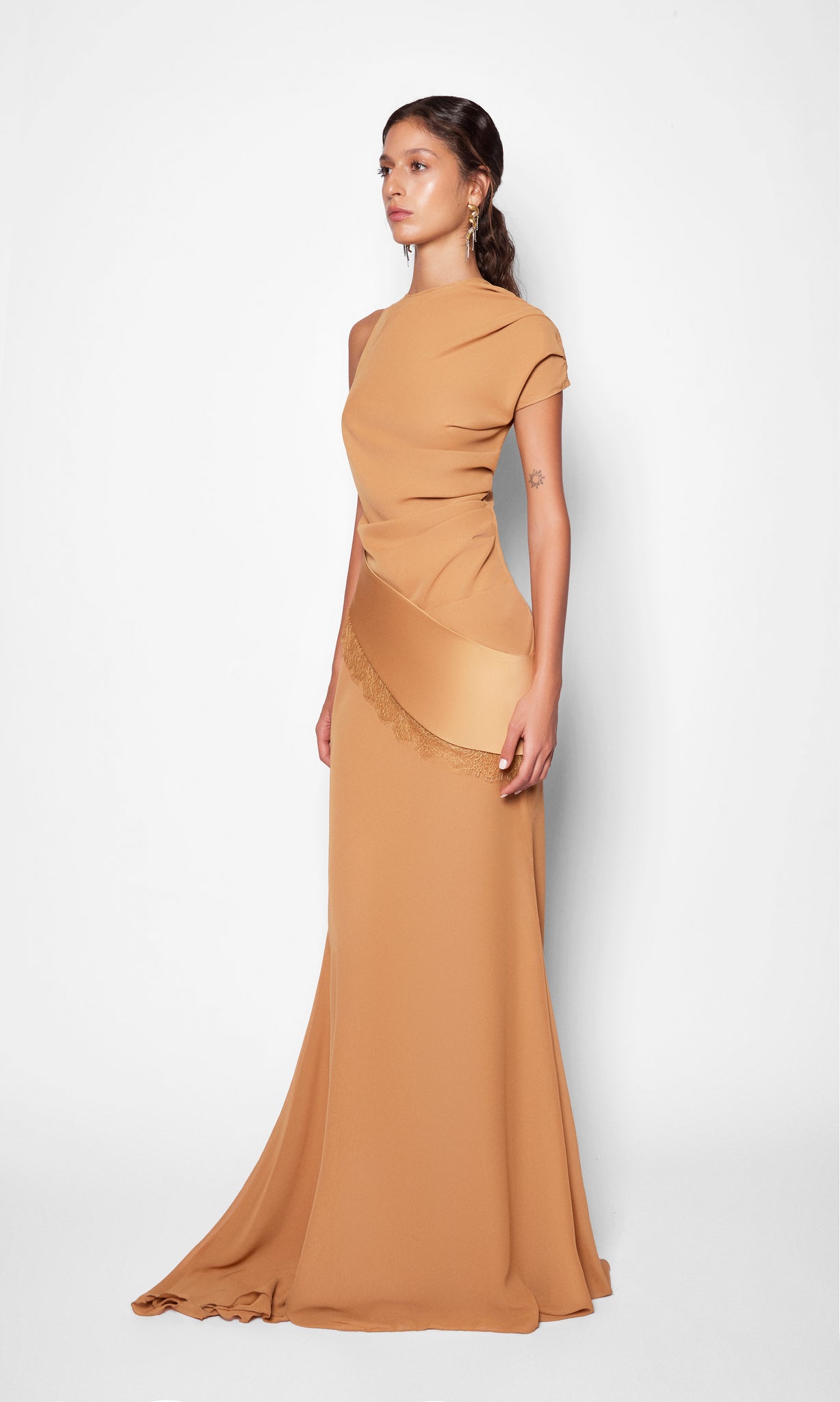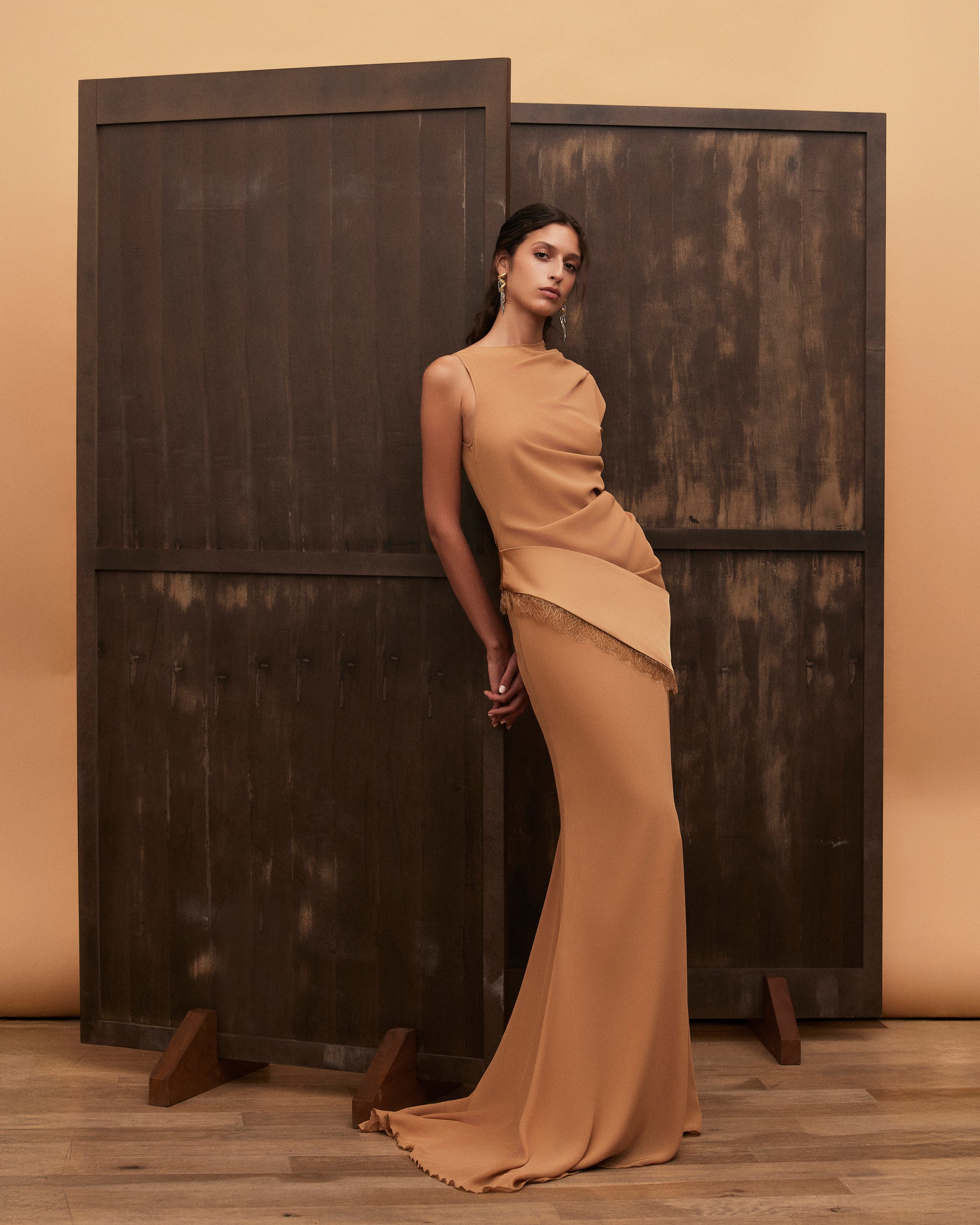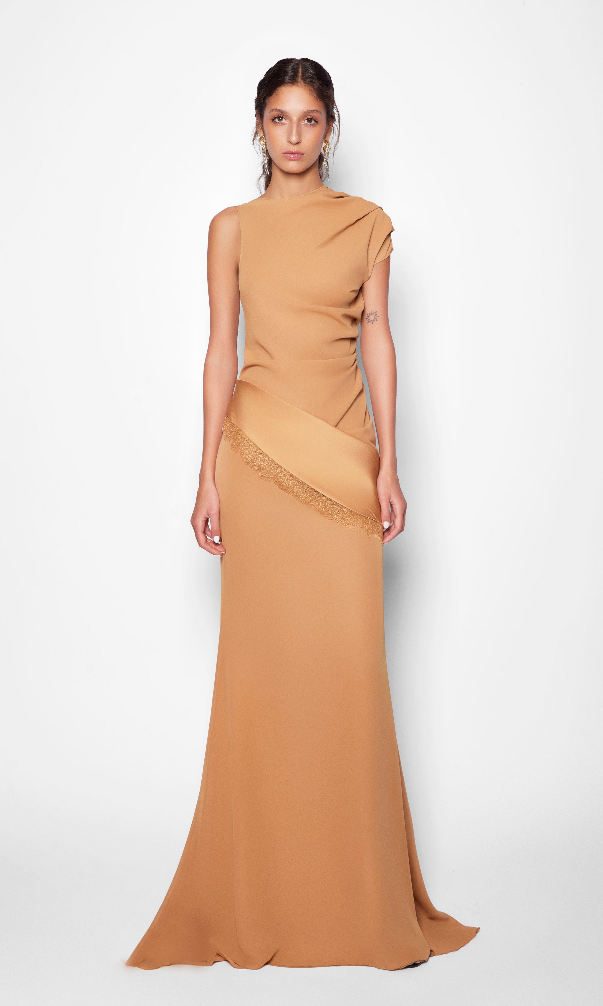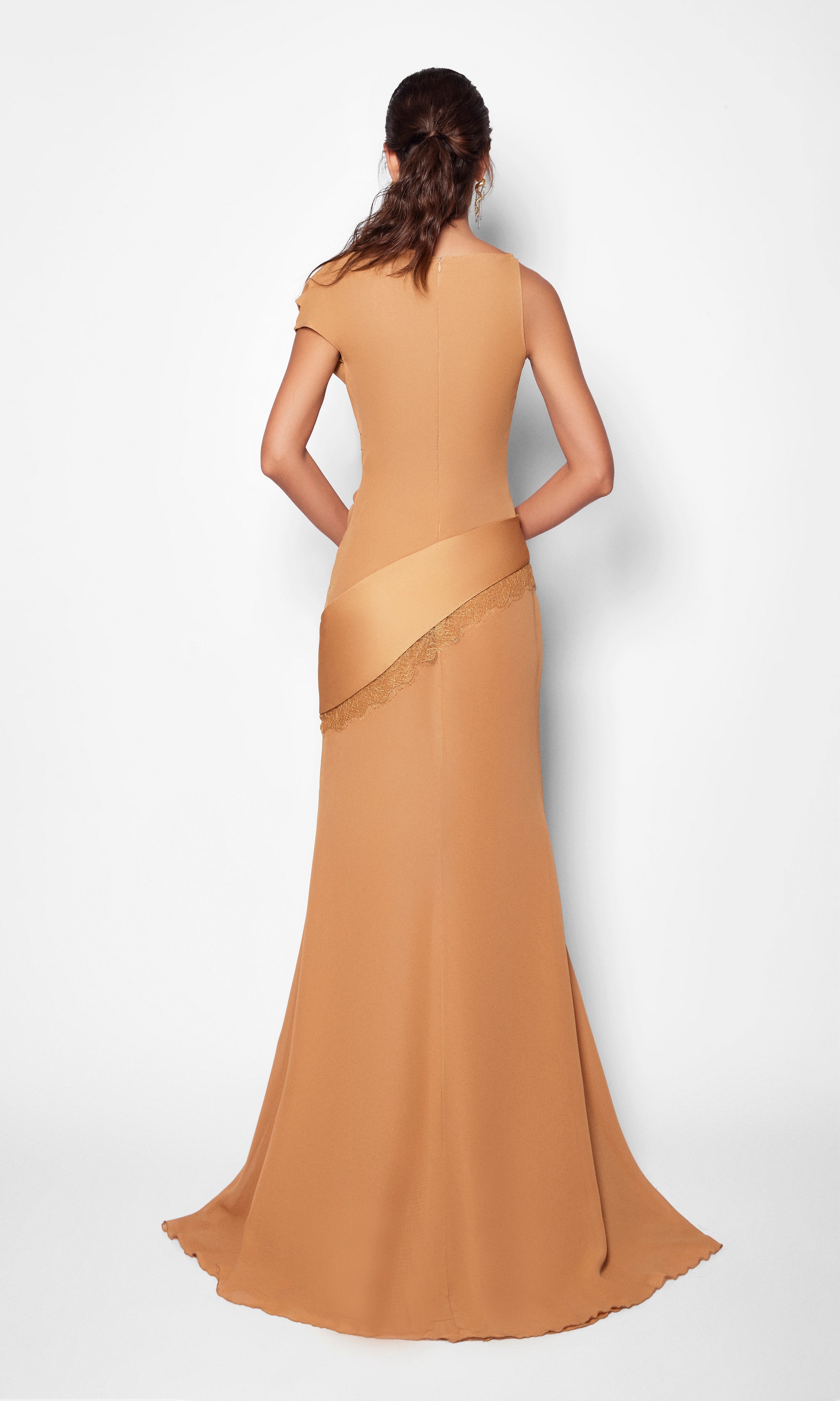 This two-piece set is crafted from lightweight mousseline, balancing fluidity with structure. The skirt contours the hips and thighs before softly flaring from the knee into an évasé silhouette, creating graceful movement with every step. The asymmetrically draped top showcases a sculptural, moulage-inspired construction, finished with a satin-trimmed hemline and delicate lace detailing that add subtle contrast and refined allure to the ensemble.