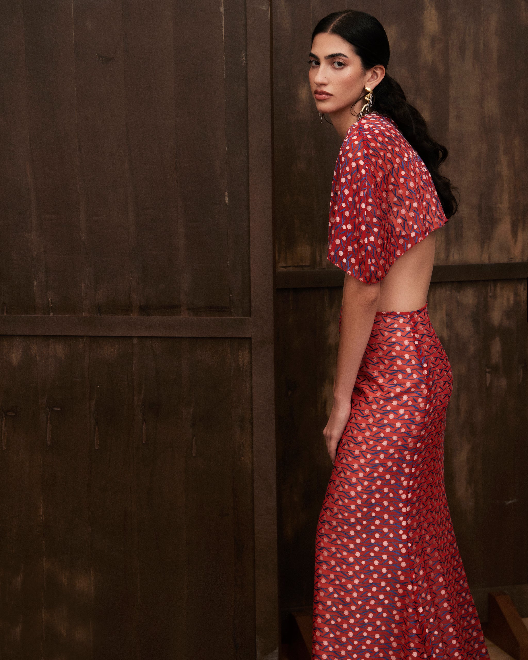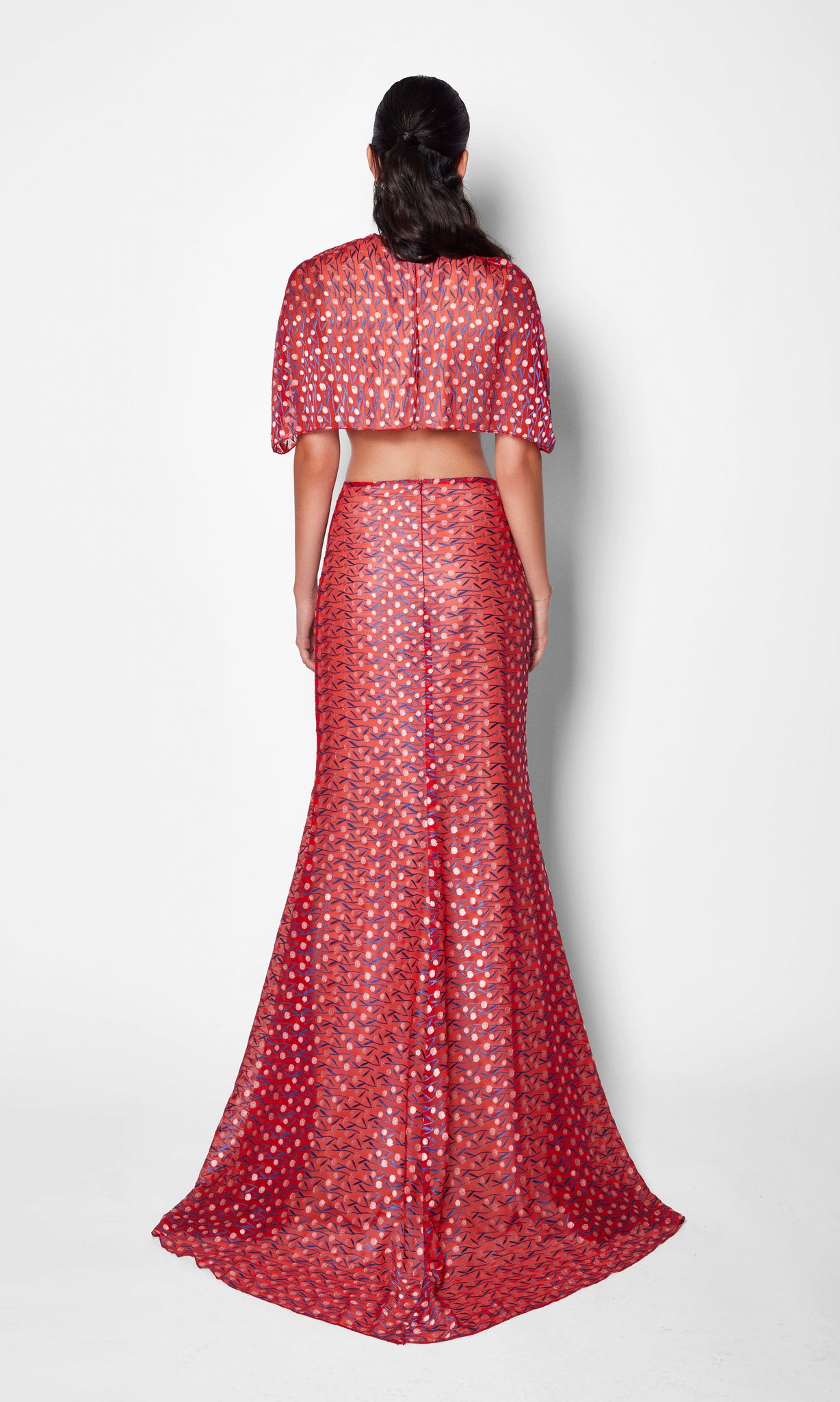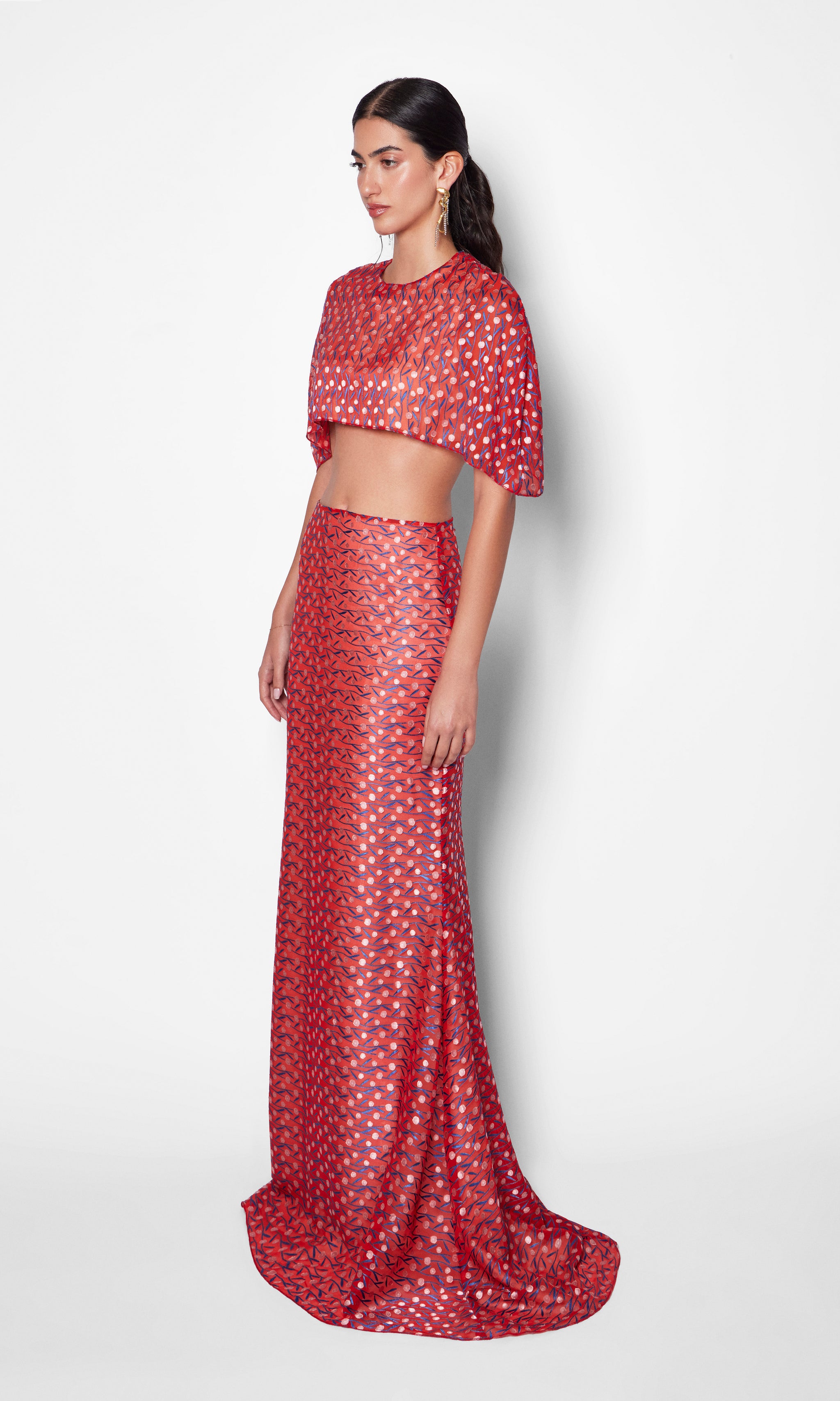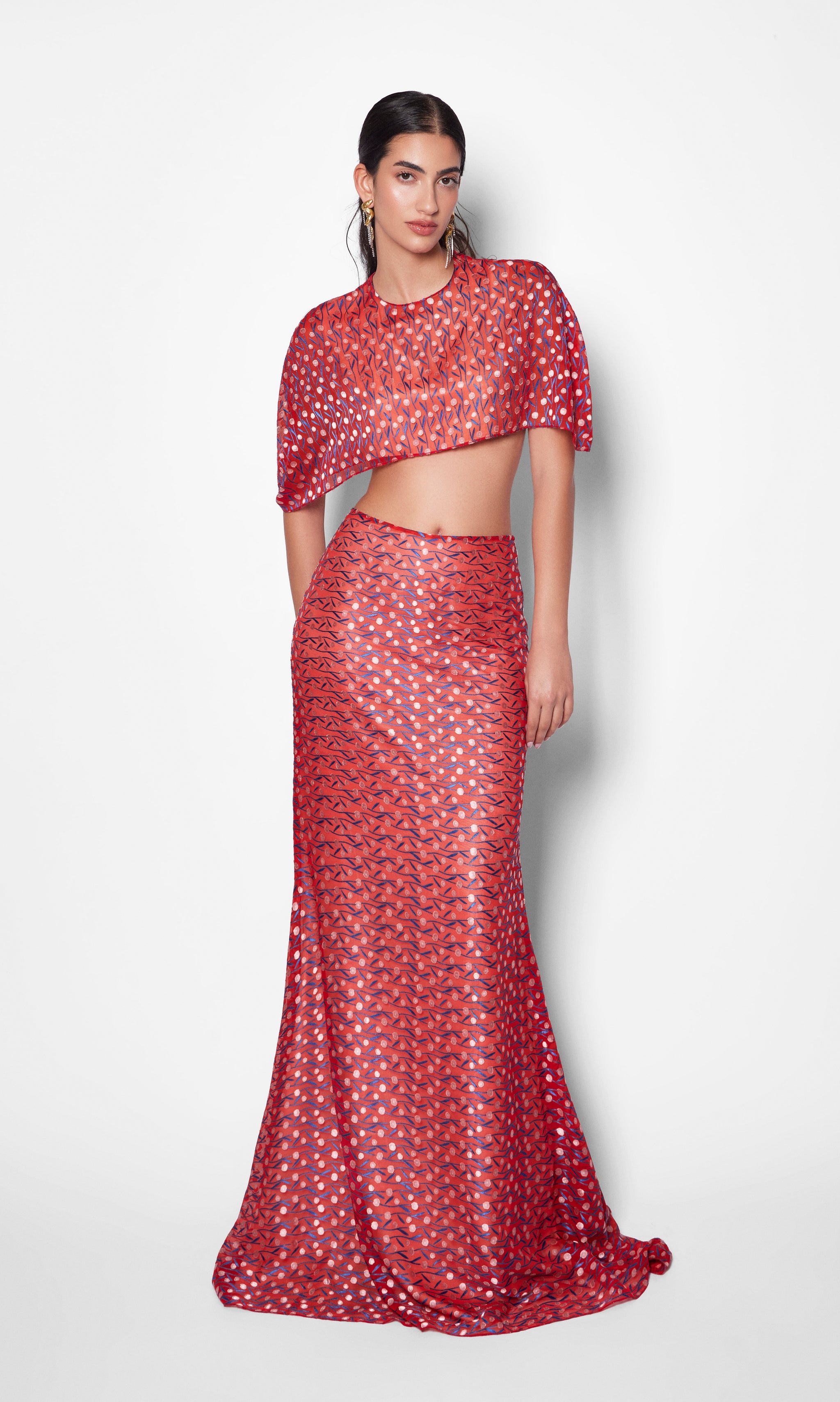 This look features a bold, striking red floor-length skirt with an intricate, playful pattern, paired with a matching bolero-style top. The skirt’s all-over motif adds visual interest, while the top’s minimalist design keeps the ensemble clean and modern. Together, they create a refined yet effortless outfit—perfect for a stylish evening out or a festive gathering.