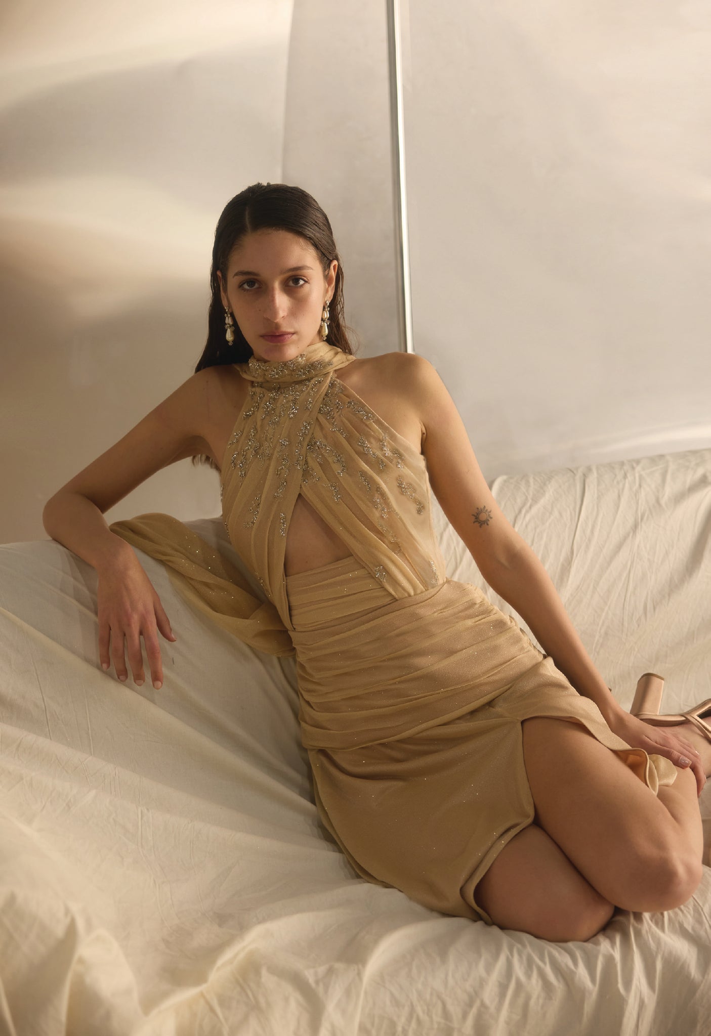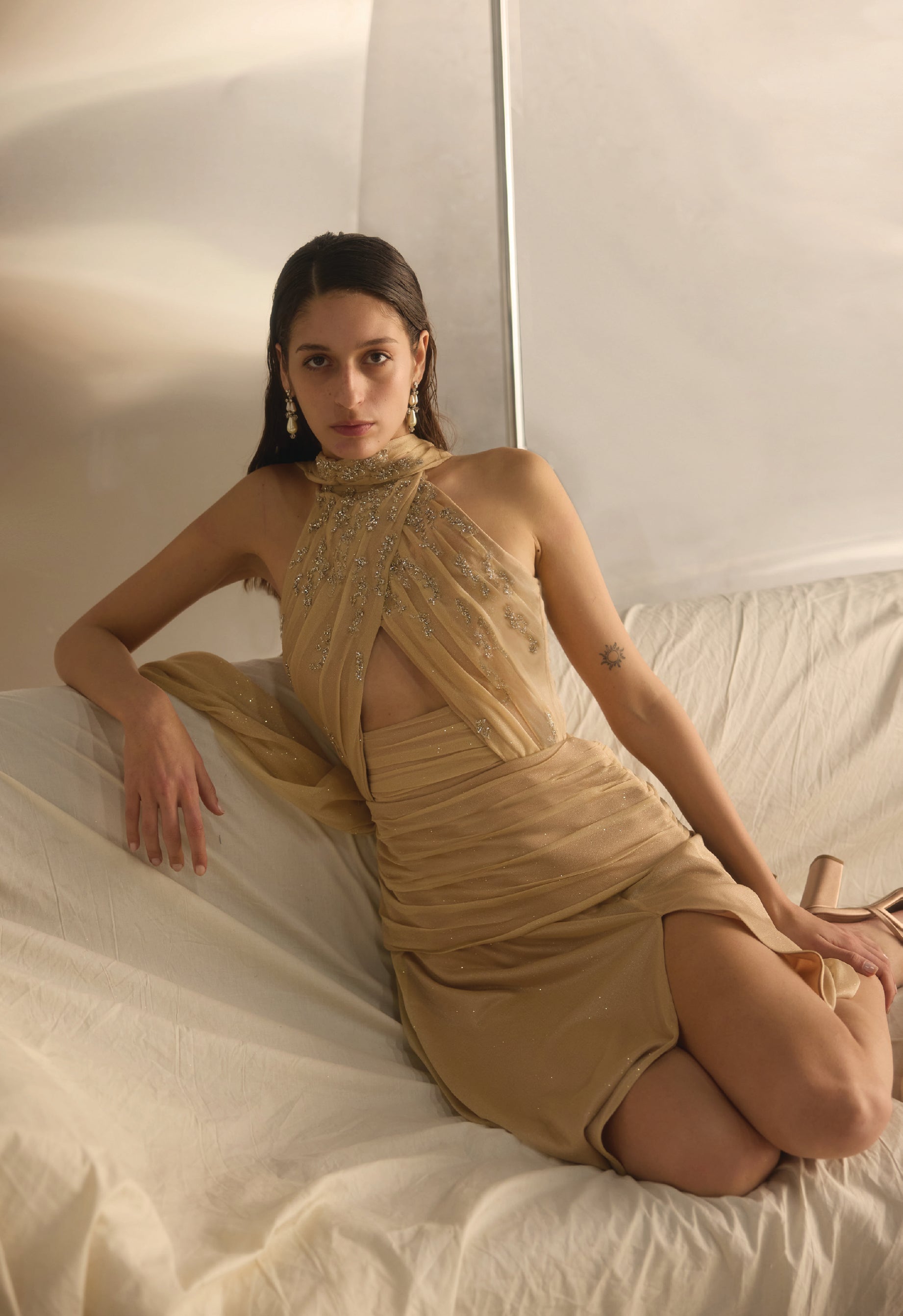 This breathtaking gown exudes timeless elegance with a contemporary twist. The intricately embellished halter neckline cascades into delicately draped panels, creating a soft, sculptural effect. A sheer bodice adds sensuality, while the cinched waist flows into a shimmering floor-length skirt with a daring thigh-high slit. Effortlessly glamorous, this golden-hued design is perfect for grand soirées and red-carpet moments.