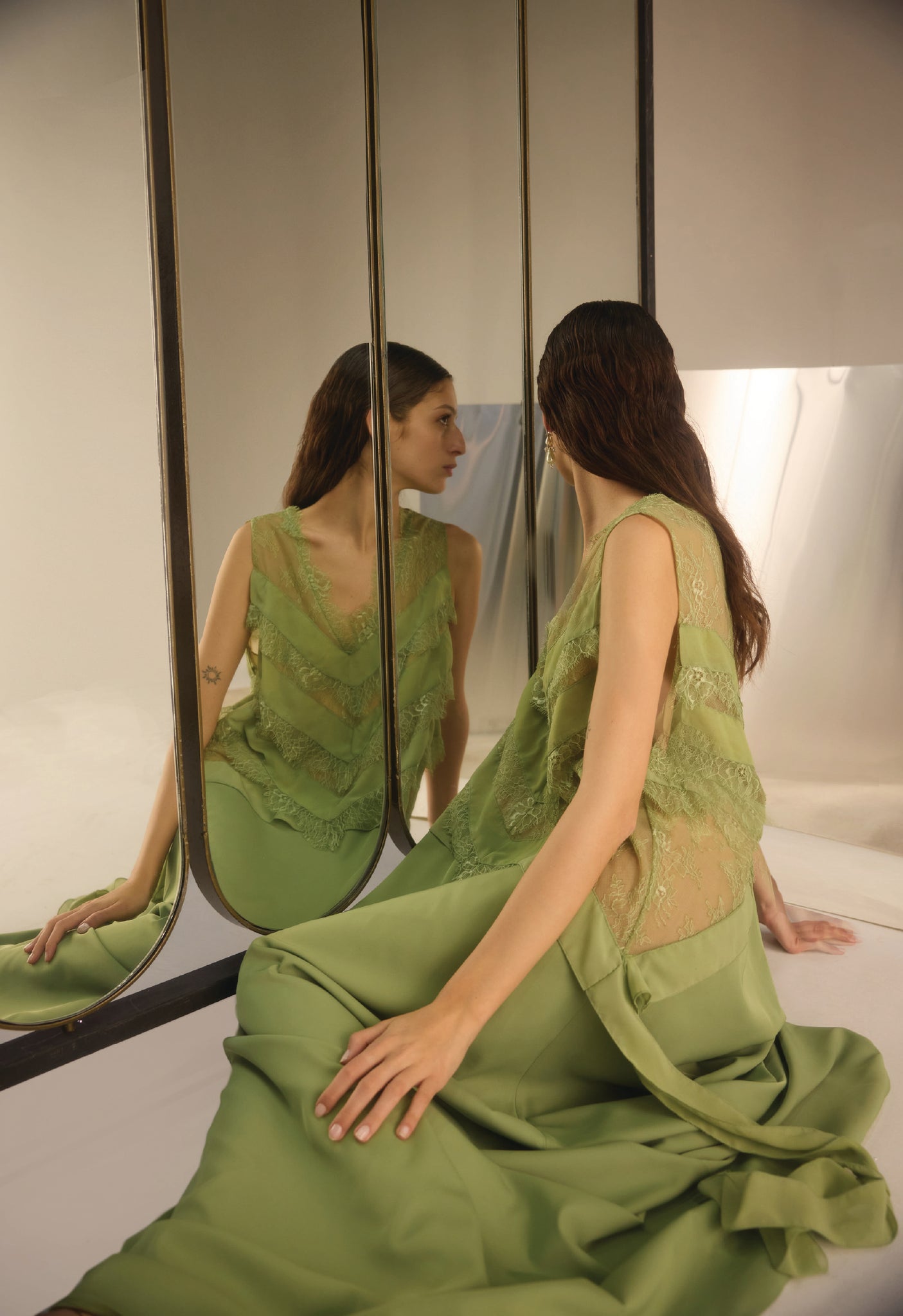This look features a flowing, floor-length gown in a soft gradient shade of green. The sleeveless top is designed with delicate sheer panels and intricate lace detailing arranged in a chevron pattern, creating a subtle play of transparency and texture. The deep V-neckline adds a touch of elegance, while the airy, lightweight fabric allows for graceful movement. The skirt drapes effortlessly, enhancing the ethereal and sophisticated aesthetic of the ensemble. This design blends femininity with modern refinement, making it perfect for formal occasions or evening events.