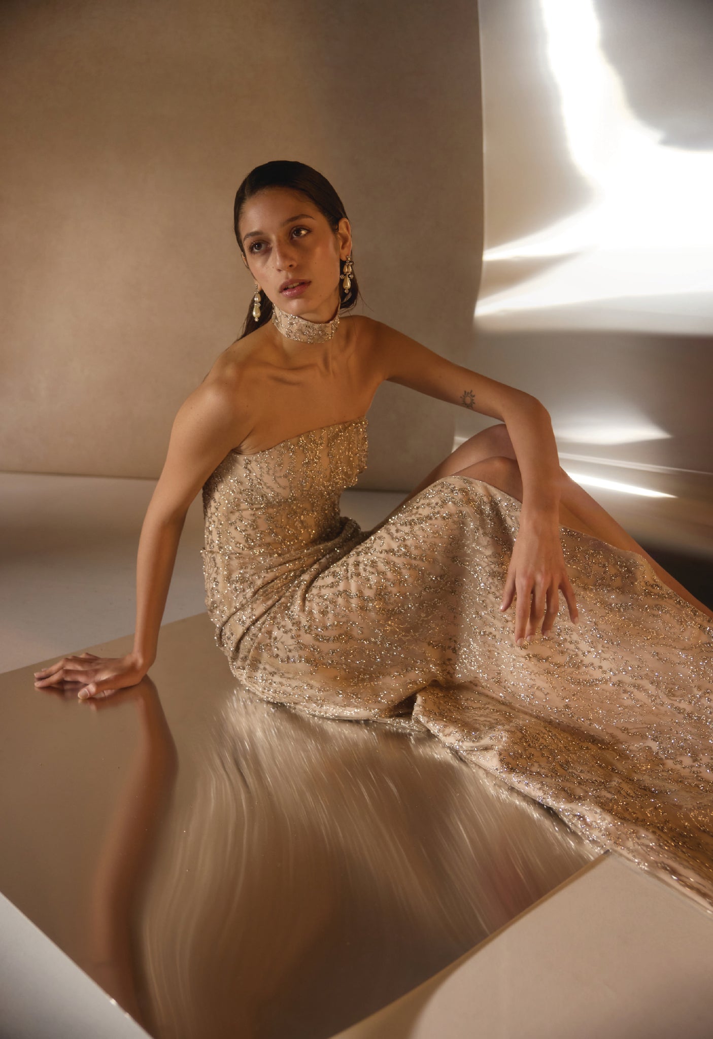 Turn heads in this stunning strapless gown, featuring a shimmering nude-gold fabric that sparkles with every step. The fitted silhouette highlights your curves, while the elegant ruching adds a flattering touch. A thigh-high slit brings a bold, sexy edge, and the matching beaded choker completes the look. Perfect for gala nights, red carpets, or any event where you want to shine.