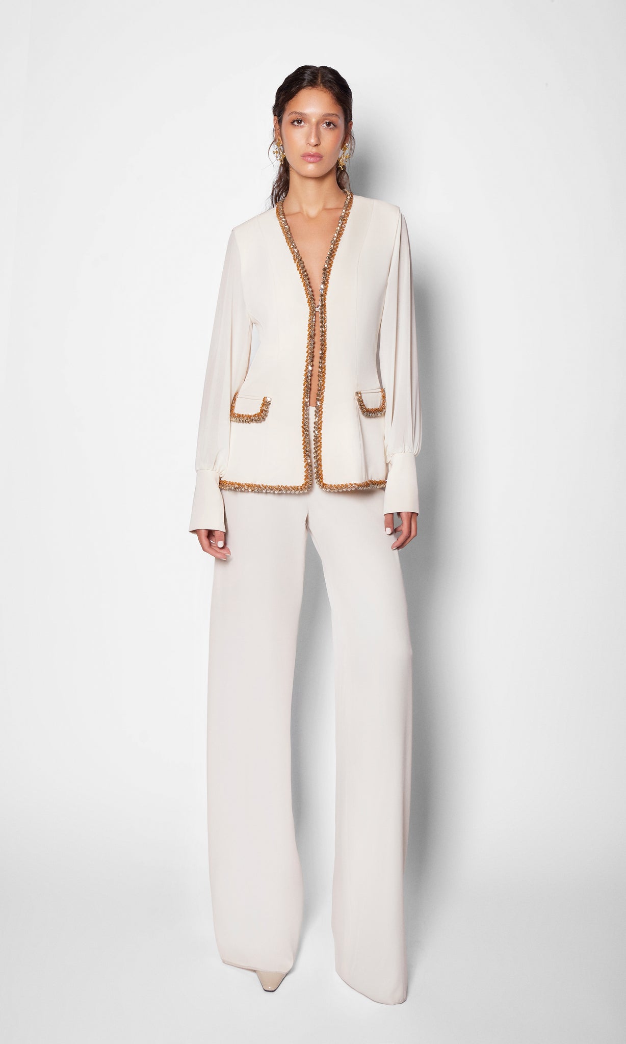 "Start Again" jacket is cut from lightweight crepe with a clean, open-front design and structured shoulders for a refined silhouette. THYM’s embroidery traces the edges and pocket flaps, adding texture and subtle luminosity. Perfect addition to your wardrobe attire!
