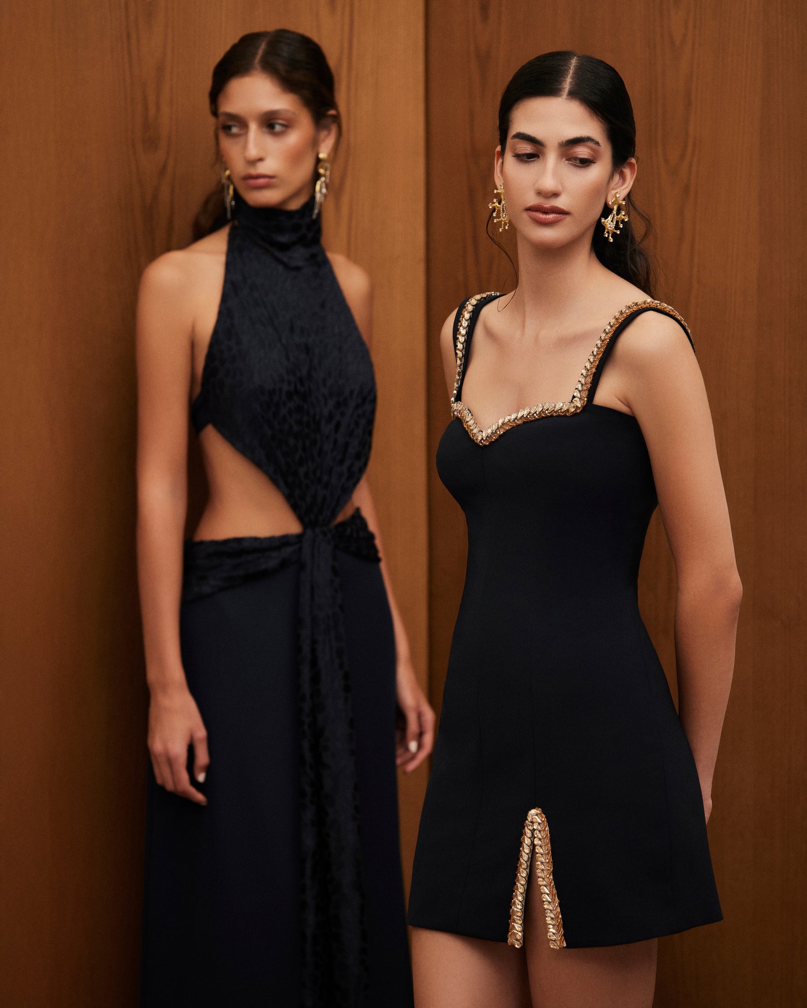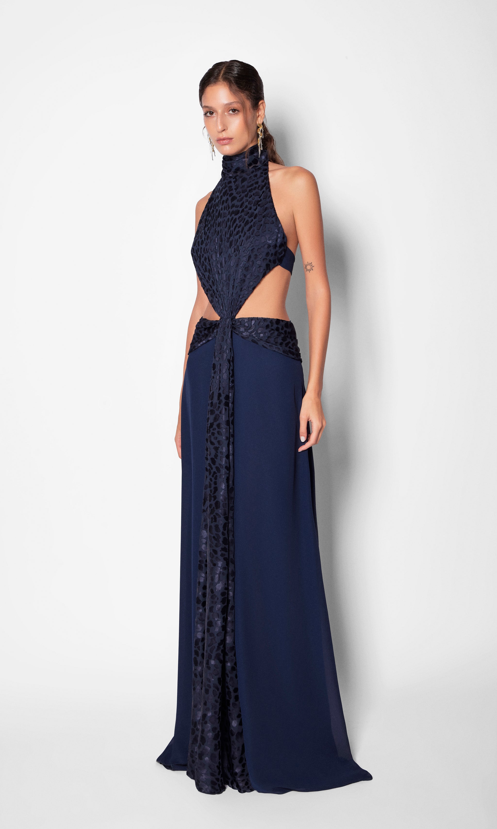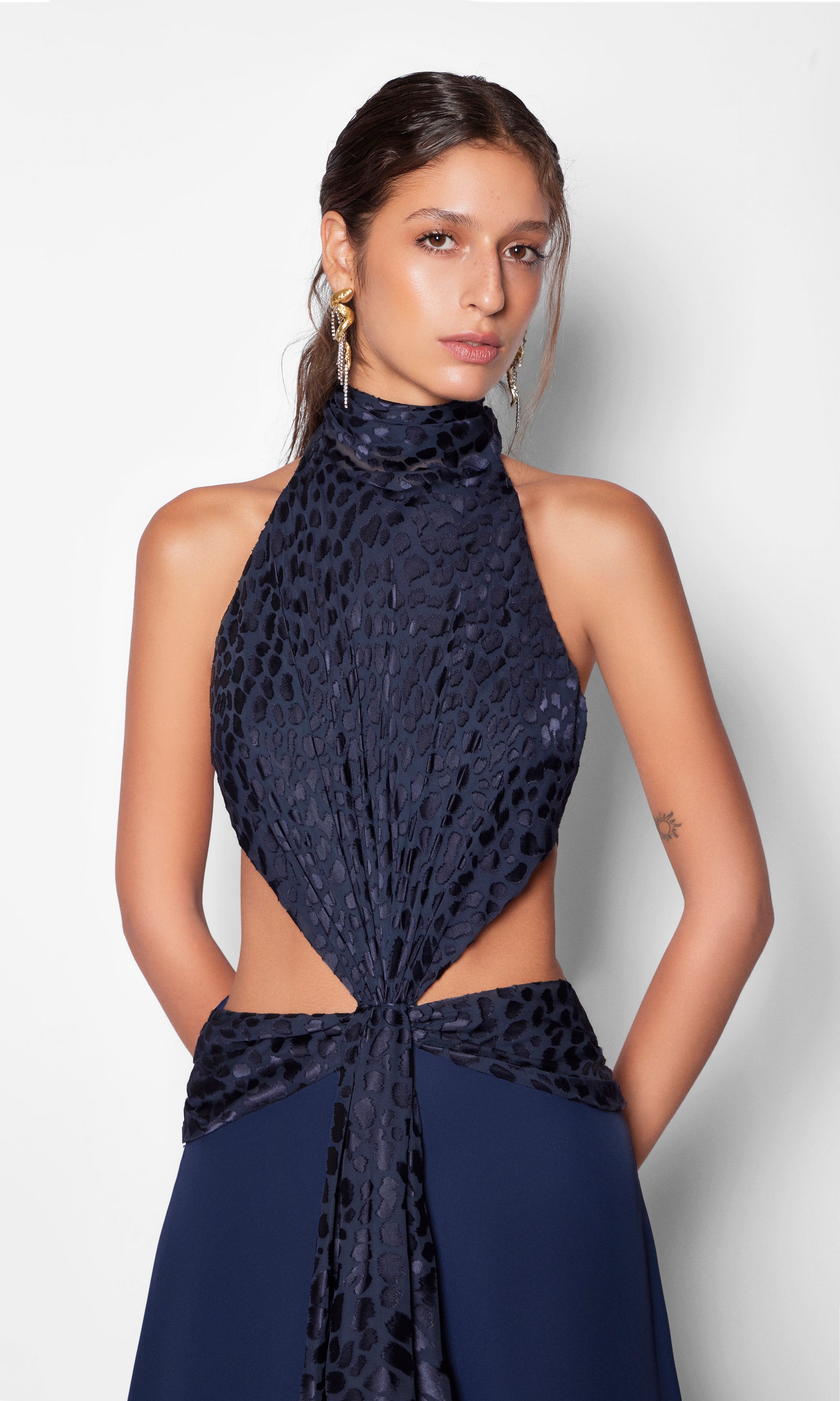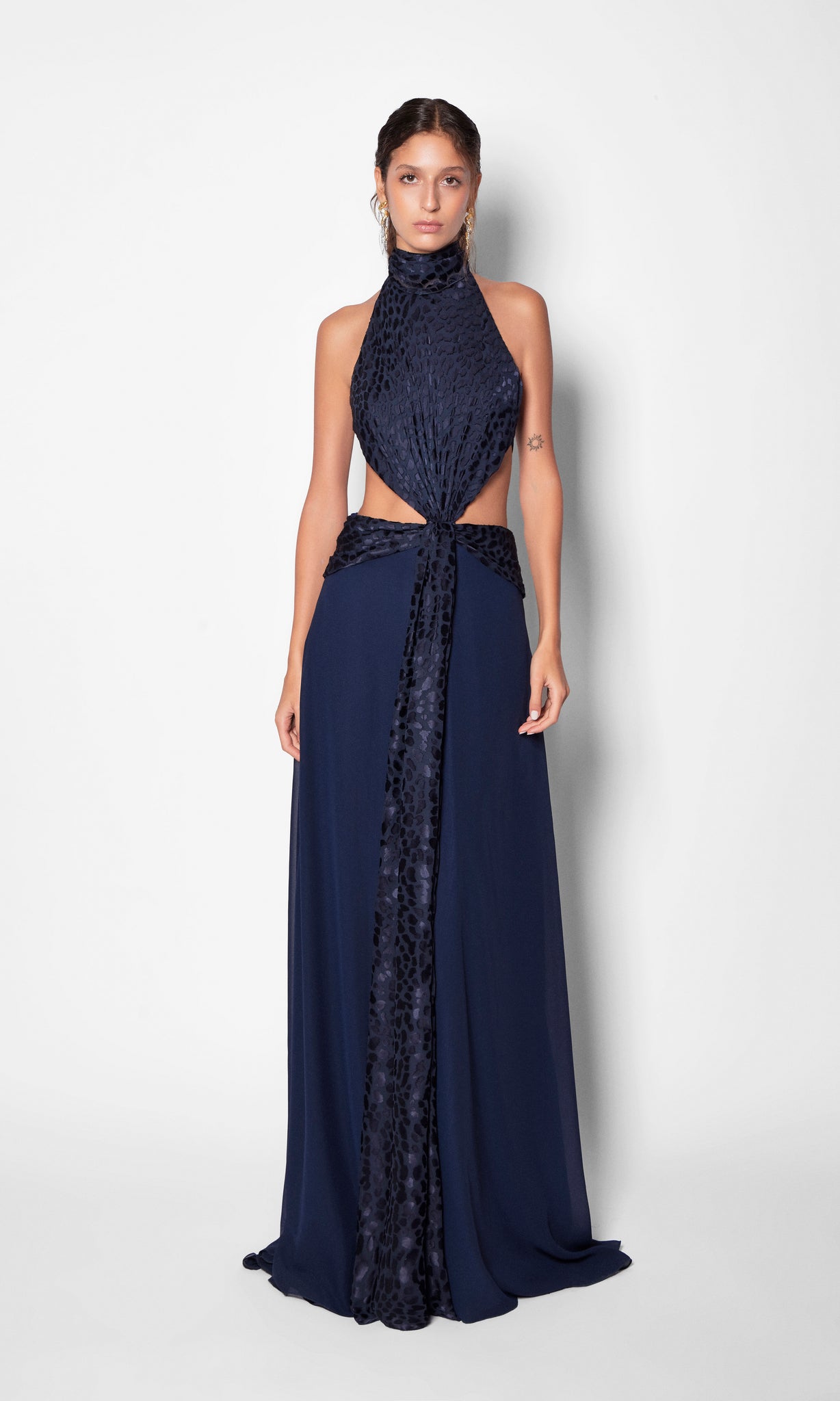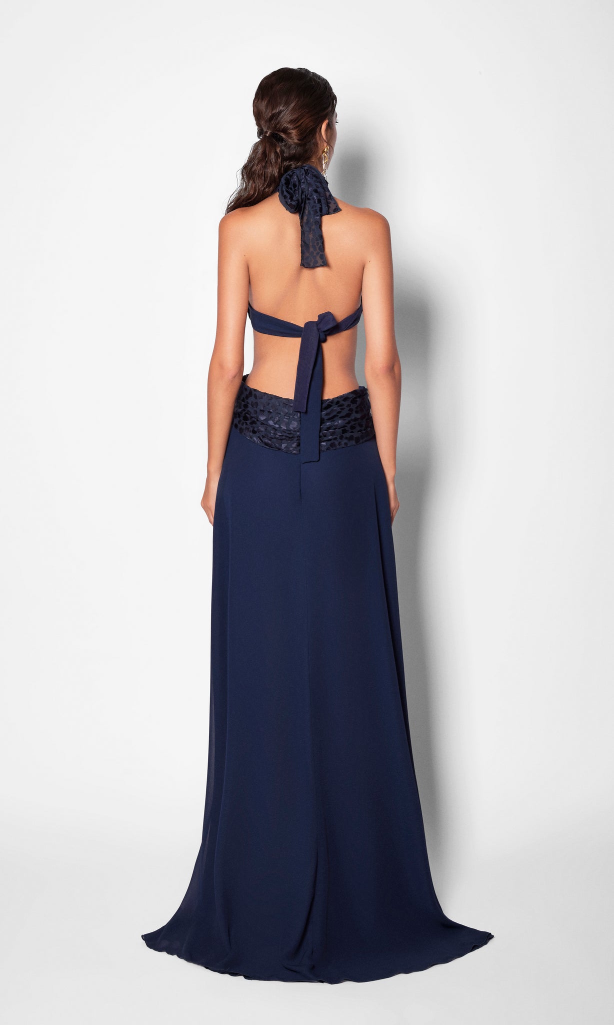 This halter-neckline gown in deep navy is crafted from a fluid, lightweight mousseline that drapes effortlessly over the body. Cutout details at the waist introduce a bold, modern touch that accentuates the silhouette, while the skirt falls into a soft, voluminous shape, offering both movement and balance. An open-back design enhances the gown’s architectural harmony, and the elongated front tie adds a sense of fluidity and elongation. Refined yet contemporary, the design seamlessly merges precise tailoring with graceful drapery for a striking, understated evening look.