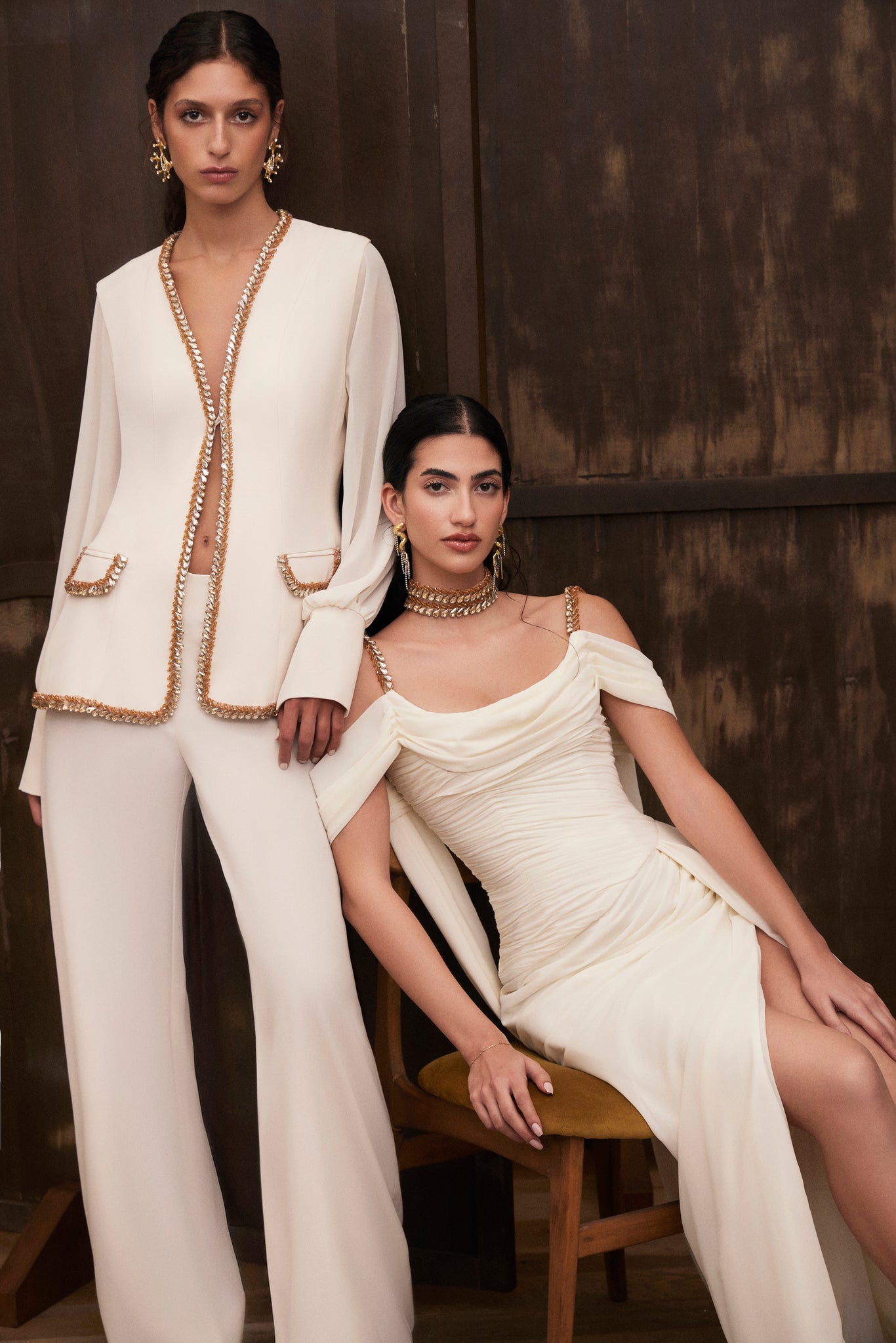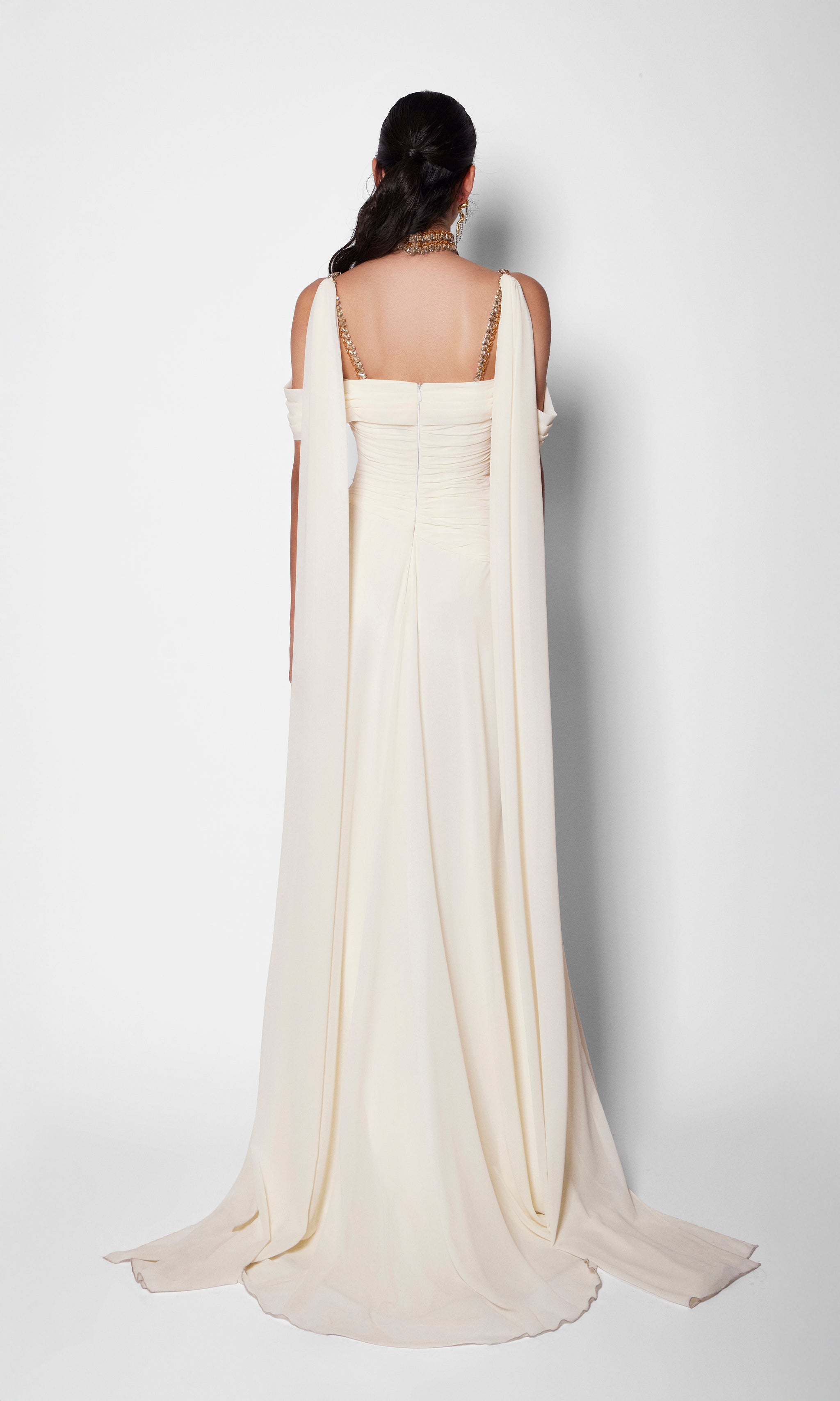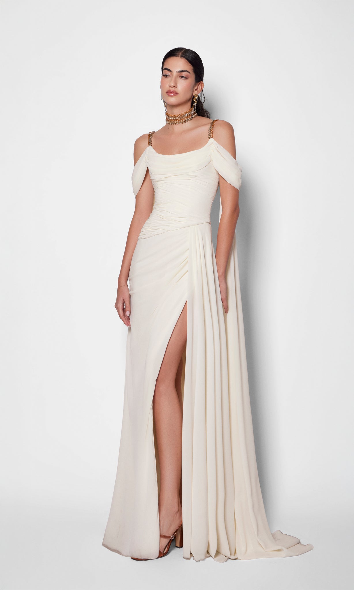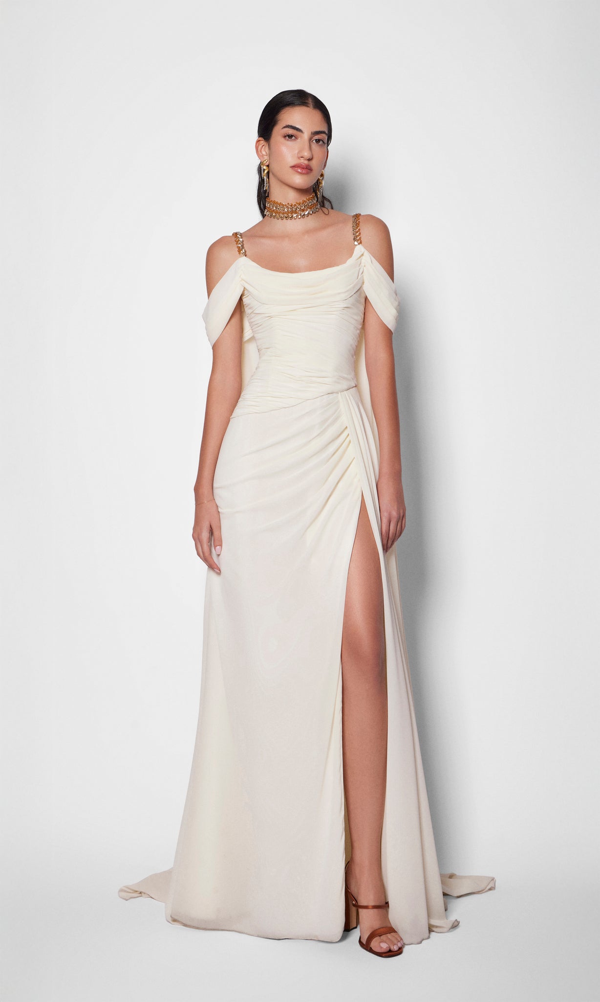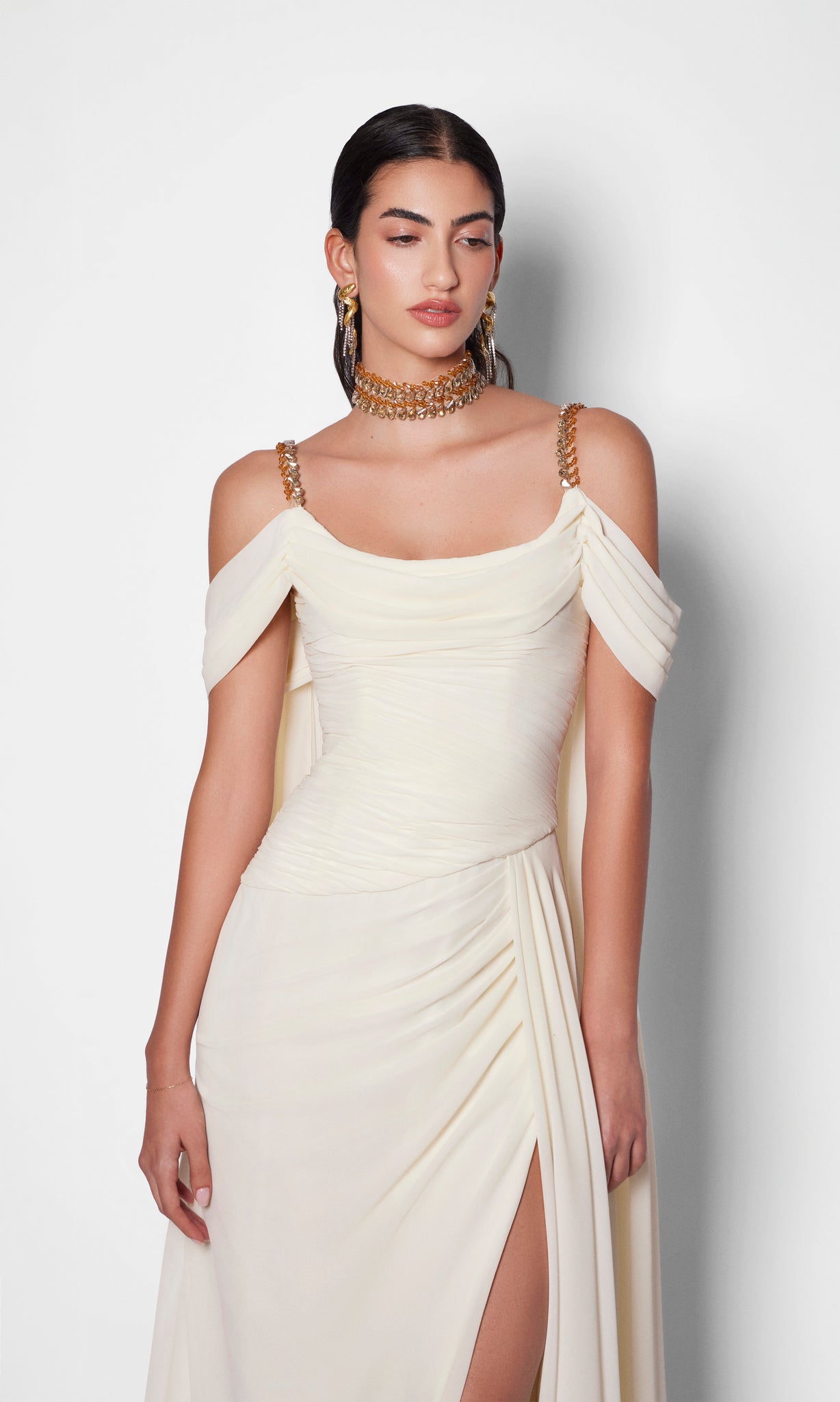 An ivory gown that radiates understated glamour, featuring delicately draped mousseline that softly contours the bodice and flows into an elegant floor-length skirt. THYM’s jewelry embroidery punctuates the look, complemented by off-shoulder sleeves that create a soft, feminine appeal. A high slit adds a modern element to the classic silhouette. Elegant and versatile, this gown is ideal for formal occasions or special celebrations.