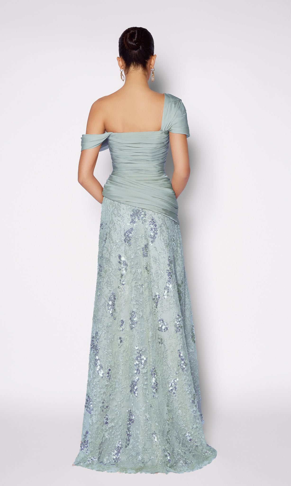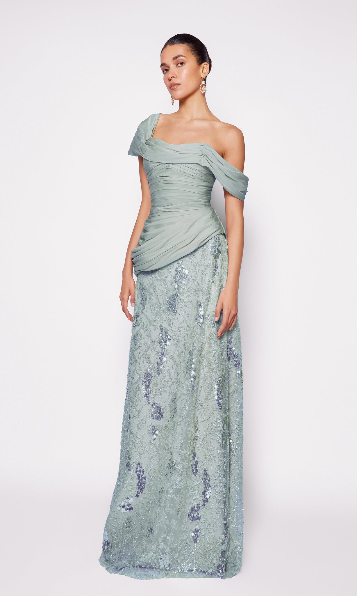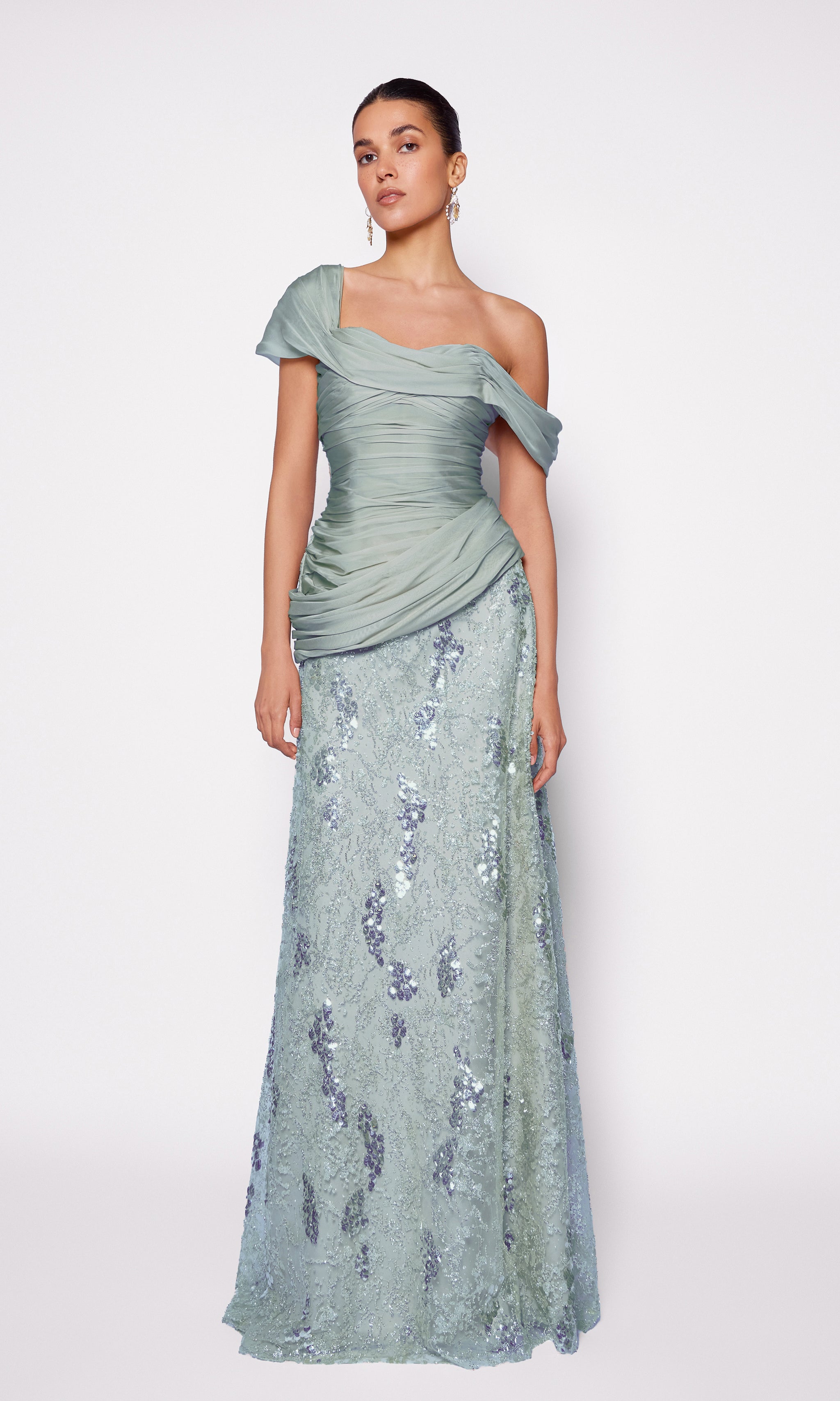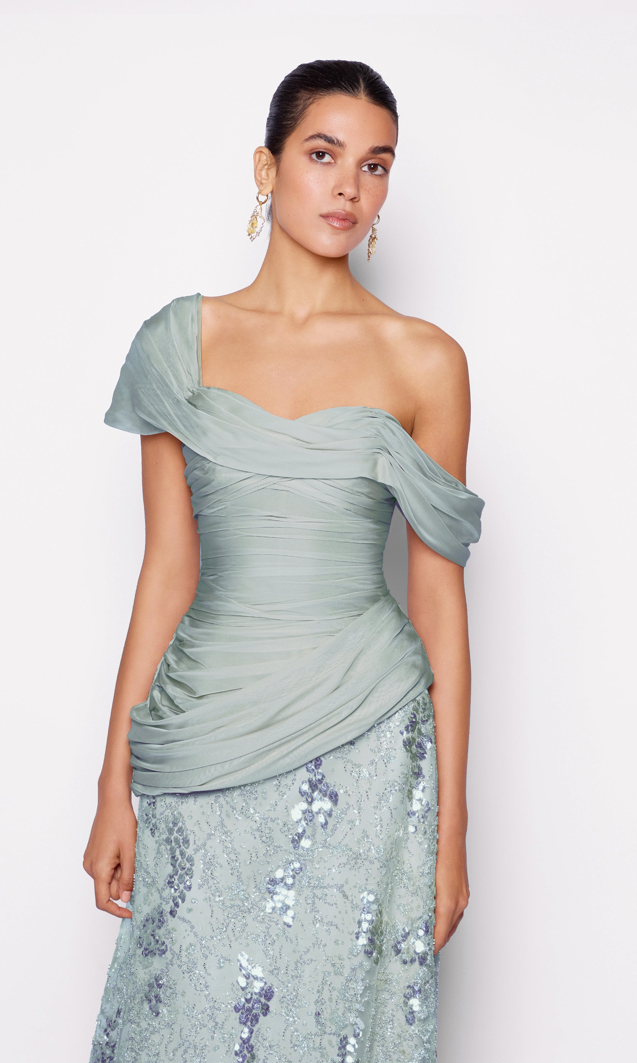 This figure-sculpting evening look features a softly draped corset cut from mousseline. The asymmetrical neckline and draped detailing sculpt the silhouette while adding effortless elegance. It’s paired with a floor-length sequin-embroidered skirt that contours the silhouette and shimmers with every step balancing fluid elegance with luminous texture for a modern, refined statement.