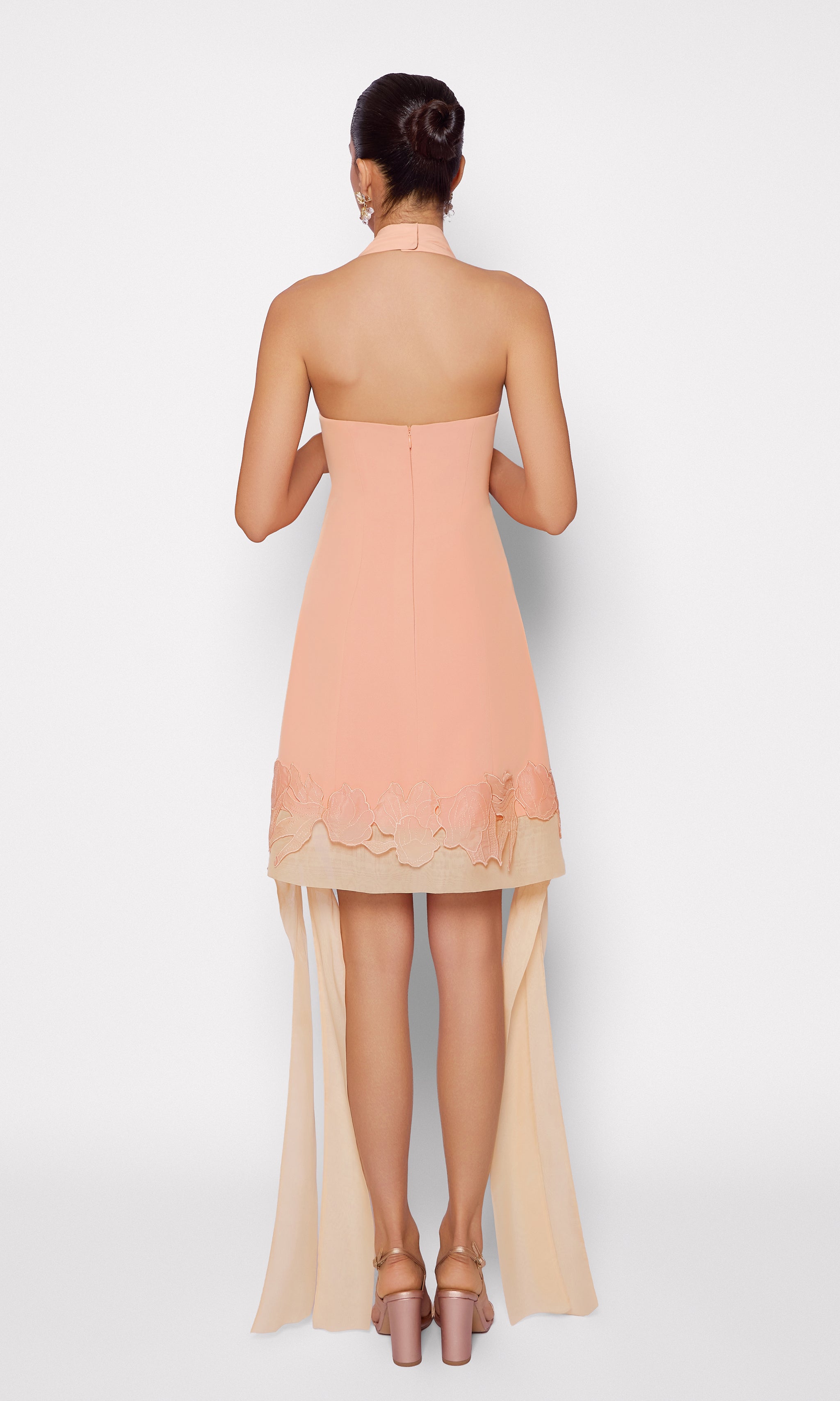 Perfect for a night out, this mini dress is designed to make a statement. Cut from structured crepe, it features a sleek halter neckline and a fitted silhouette that enhances the body. The hemline is crafted from soft mousseline, cascading into a fluid, elongated back for added movement. Delicate organza floral appliqué adorns the hem, adding a romantic, elevated finish.