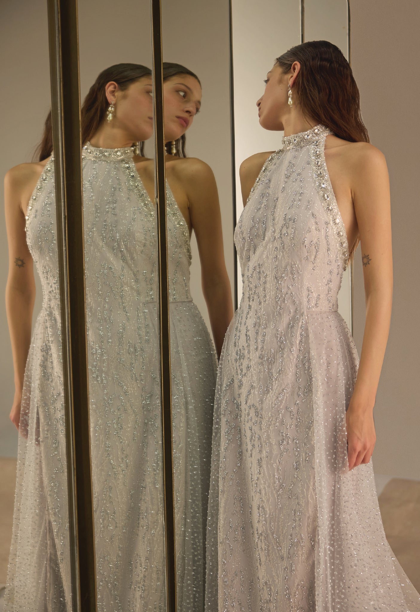 This gown is a breathtaking masterpiece, exuding elegance and luxury. It features a high halter neckline adorned with shimmering embellishments that extend throughout the entire dress, creating a cascading effect of delicate sparkle. The fitted silhouette gracefully contours the body before flowing into a soft, ethereal train. A sheer, beaded overlay adds a layer of sophistication, enhancing the gown’s regal appeal. The subtle yet intricate detailing gives this dress a timeless charm, making it a perfect choice for glamorous evening events, galas, or red-carpet occasions.
